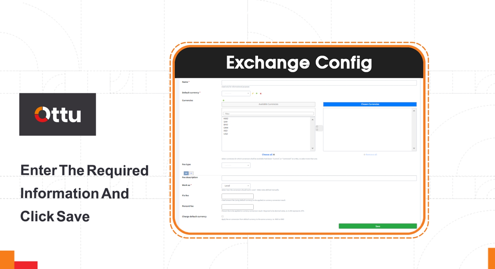 Enter all necessary details, such as the currencies involved and any specific rules or markup fees. Once all the information is provided, click on Save to finalize the configuration.
