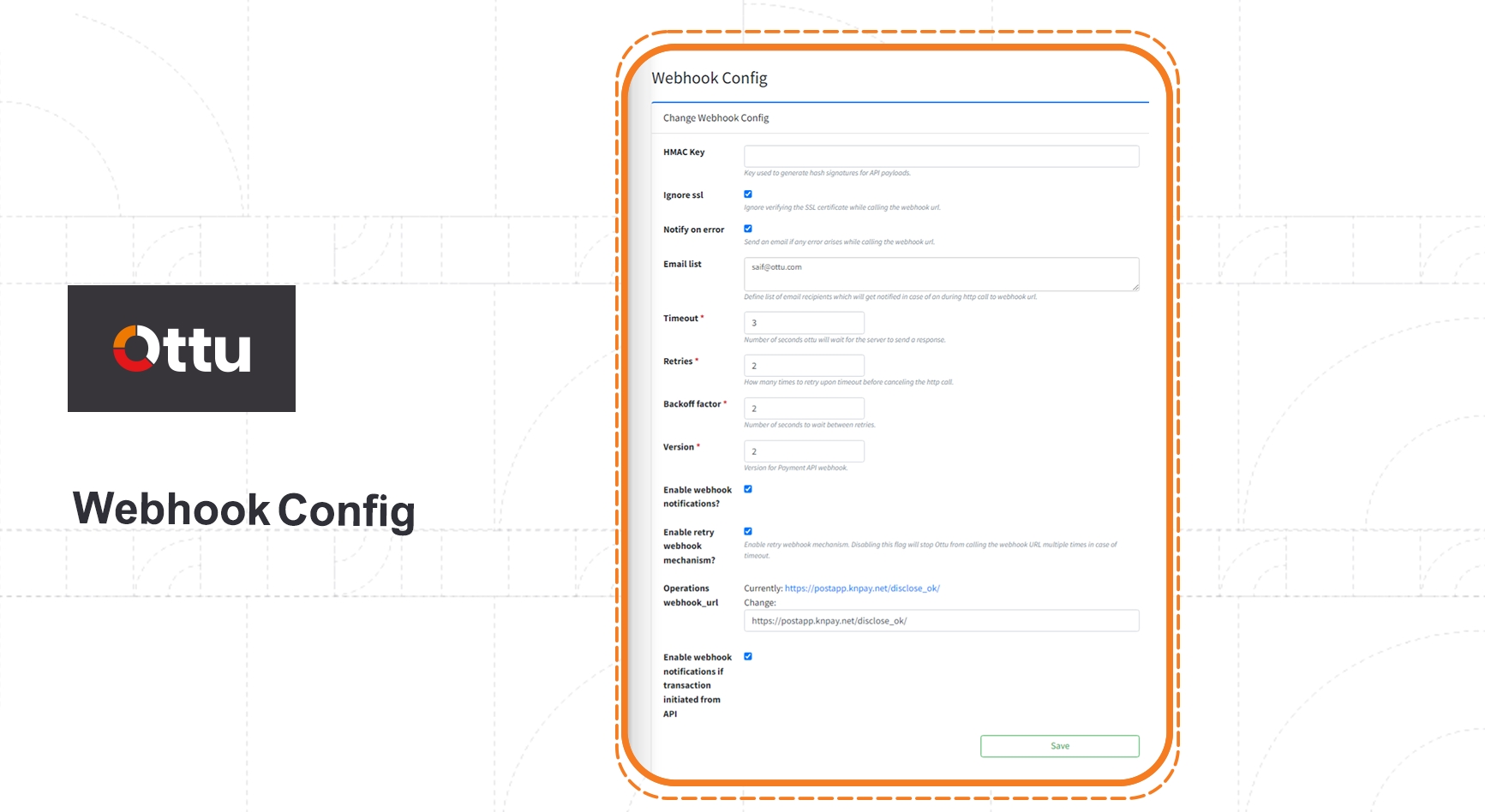Enable retry webhook mechanism? If checked, the retry webhook mechanism becomes operational, permitting Ottu to make multiple attempts to reach the webhook URL if a timeout occurs. If this feature is disabled, no further retries will occur, which could lead to some webhook calls being missed.