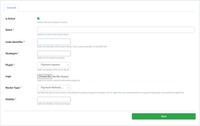 From the Ottu Dashboard, click on the three dots in the top right corner and select Administration Panel. Proceed to the PGSR section. Click on the Add Smart Router button, and a configuration form will automatically display. The form requires the following parameters to be filled: