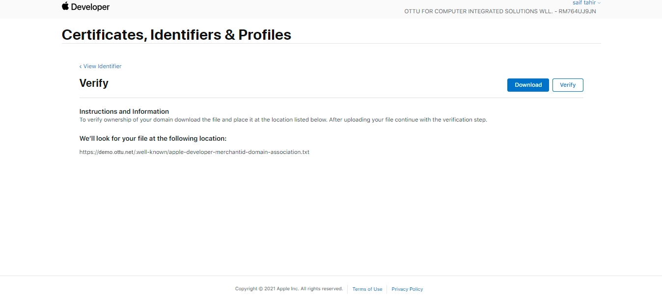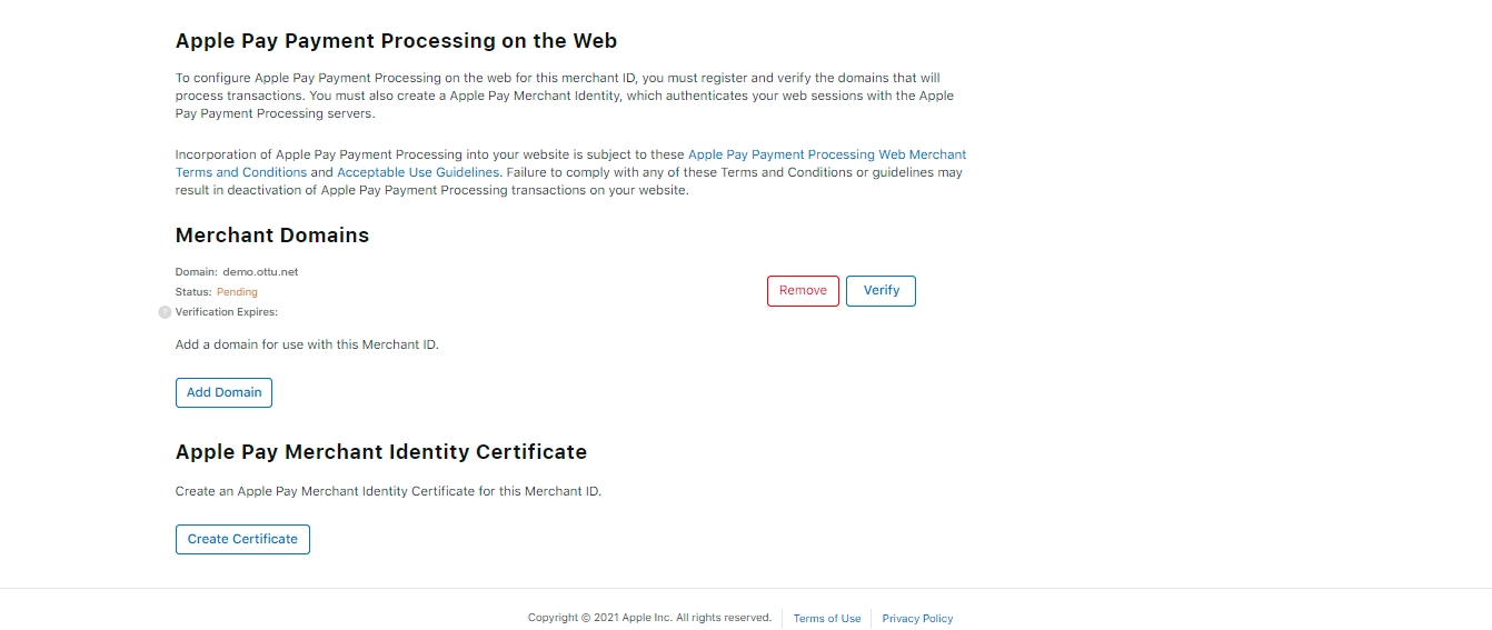 Once you have added the Apple Pay service and submitted the .text file on the Ottu side, you should verify the domain on the Apple side.