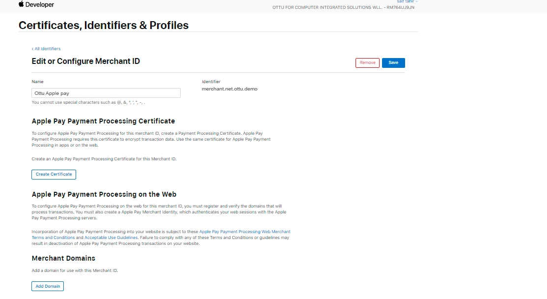 From the Identifiers section, select the merchant ID that you created in the previous step (e.g., “Ottu Apple Pay”).