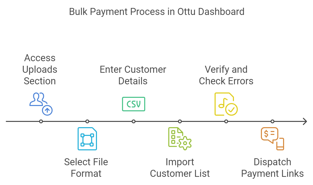 Creating bulk payment requests with Ottu's platform is a streamlined process that simplifies managing multiple transactions. This guide provides a step-by-step overview, from accessing the necessary tools in the dashboard to finalizing the payment requests, ensuring efficient handling of bulk payments for your business needs.