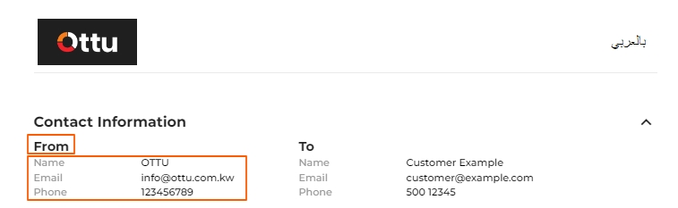 The contact information section typically displays details for both the merchant and the customer. It consists of two subsections.