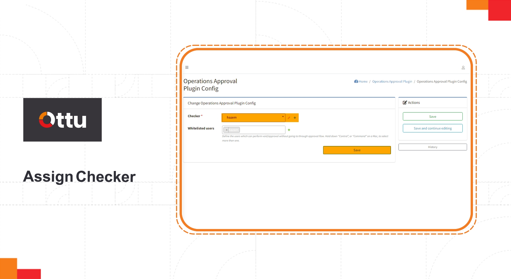 Only one authorized user can assign a checker user. To assign a checker: From the Ottu Dashboard > locate the Administration Panel > then navigate to the Operations Approval Plugin > and select Operations Approval Plugin Config.